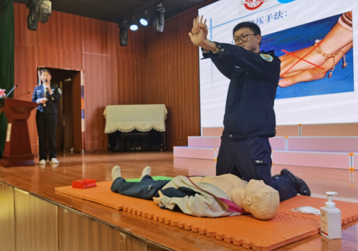 本次活动通过现场授课和实际操作的形式对学生们进行培训。首先,急救中心护士王影通过PPT课件为同学们详细的讲解心肺复苏相关知识,急救中心护士关昕配合操作演示,让同学们能够边听边看边学,得到了同学们的阵阵掌声。