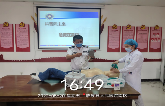 为积极响应阜阳市“科普活动周”主题活动,提高广大医务人员对急诊急救技术操作的能力,临泉县急救中心联合临泉县人民医院急诊医学科开展“科普向未来 急救在身边”主题活动。 首先,由临泉县人民医院急诊医学科护士长急诊急救专科护士张艳芝,为全院机动库小组成员详细讲解了CPR+简易呼吸囊+电除颤相关知识。 随后,由临泉县急救中心医生何方与张艳芝护士长共同为大家演示具体操作方法,何方和张艳芝从快速识别患者病情到具体的抢救流程给予一一演示,重点培训了呼吸气囊及除颤仪的使用方法。